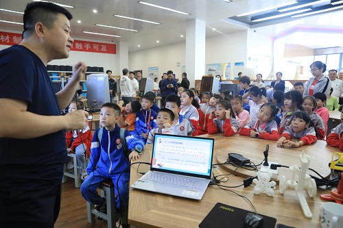 “将三维模型建好之后,在切片软件上设置相关的参数对模型进行切片离散处理,然后在3D打印设备上制作产品……”科普教育活动现场,学校教师唐锋和易辉成展示了3D产品的制作过程,并鼓励小朋友们参与到产品的设计与实操过程之中。