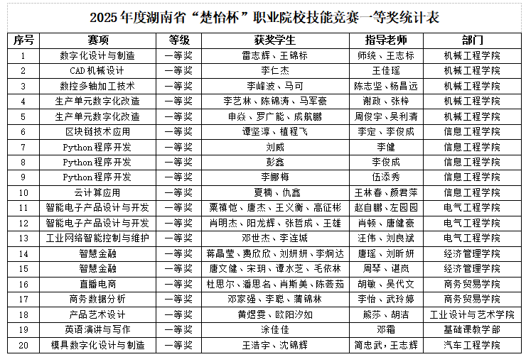 本网讯 近日,2025年度“楚怡杯”湖南省职业院校技能竞赛圆满落幕,学校参赛团队凭借扎实的专业功底、过硬的实践能力和出色的创新思维,斩获省赛奖项80项,其中一等奖20项、二等奖22项、三等奖38项。