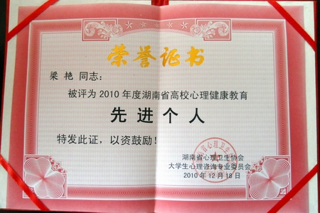 心理健康教育与心理咨询中心梁艳老师被授予“2010年度湖南省高校心理健康教育先进个人”称号