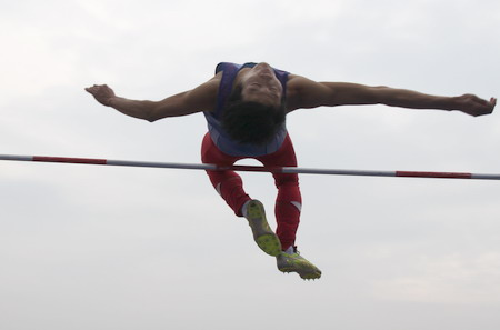 时间似乎在这一瞬间停止,跳高选手像一只雄鹰展翅翱翔在蓝天上