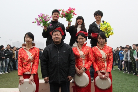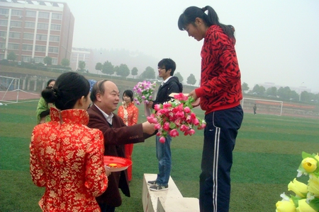 裁判长宣布团体比赛成绩之后,第九届田径运动会颁奖仪式正式开始。经过两天的激烈角逐,此次运动会决出的团体奖项有“优秀方阵代表队”(由汽车工程学院、机械工程系、信息工程系等获得)、“团体总分前三名系代表队”(由机械工程系、经济管理系和汽车工程学院夺得)、“体育道德风尚奖”(由电气工程系夺得)。学院院长刘建湘教授、学院党委副书记周立华、学院调研员刘琼为获奖团体代表颁奖。