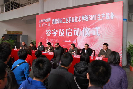 10月29日下午,酝酿已久的富士康科技集团、日本索尼公司捐赠电子pg游戏平台下载SMT设备签字及启动仪式在我院SMT车间隆重举行。来自日本索尼公司的须藤社长、营业部伊藤部长,富士康科技集团邹文祥经理、湖南省教育厅职成处处长张大伟,湖南省机械行业管理办公室副主任罗志平和我院院领导出席了签字及启动仪式,仪式由学院副院长刘继平教授主持。