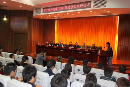 签字及启动仪式完成后还举行了“富士康SMT班”在校学生专业助学金发放仪式,共有120名“富士康SMT班”学员从富士康科技集团领导手中接过了装有1000元现金的信封。会上,08、09级“富士康SMT班”的两名学生代表分别发言,表示将珍惜此次难得的学习及锻炼机会,增强竞争意识和责任感,努力学习,积极贡献。