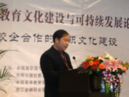 本次论坛围绕“基于校企合作的高职文化建设”主题展开交流和讨论,吸引了来自全国高职高专国家示范性院校及骨干学院的近200名高等职业教育专家、学者和院校代表参加,交流高等职业教育的文化建设思路、模式以及对高职教育发展的影响。教育部职业技术教育中心研究所副所长余祖光、浙江师范大学教科院院长(北京大学教育学院教授)眭依凡分别做了《把先进工业文化引进职业学校校园》、《大学文化及其构建的意义》的主题演讲。