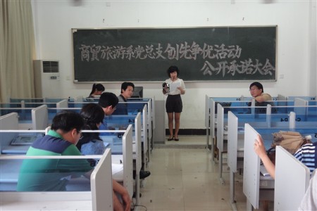 商贸旅游系党总支副书记龙凌代表系总支向全体党员作了本年度创先争优工作安排,并宣读了系总支的公开承诺。体育艺术部、思政支部书记王为、商贸旅游系教工支部书记周大力、学生党支部书记杜立林分别宣读了对系总党支的公开承诺。全体党员依次宣读了个人的公开承诺。