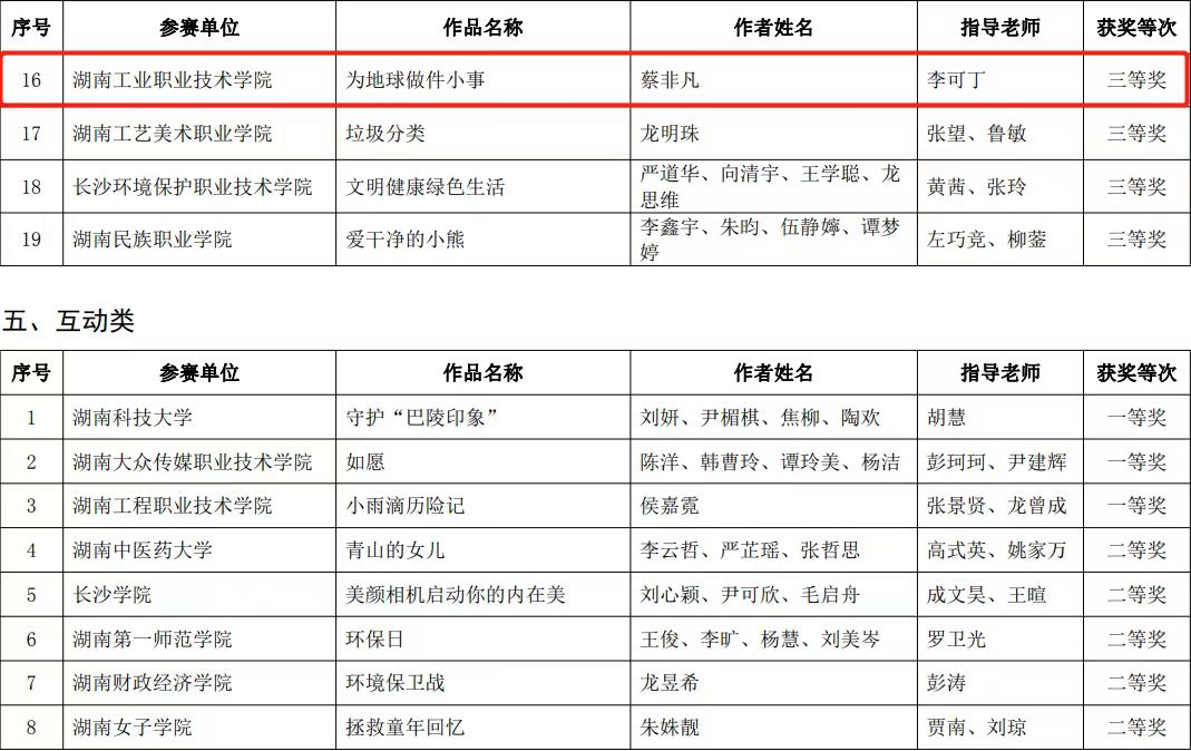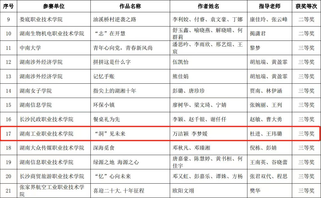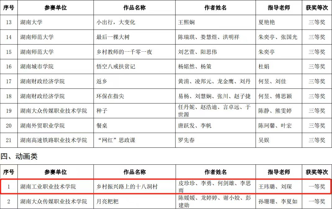 本网讯 近日,湖南省第九届大学生公益广告大赛获奖结果揭晓。我校参赛作品《乡村振兴路上的十八洞村》荣获大赛一等奖,《湘西·幸福路》、《梦想之船》获大赛二等奖,《为地球做件小事》、《“洞”见未来》获大赛三等奖。此次大赛由中共湖南省委教育工委、湖南省教育厅主办,以“青春新风尚 礼赞二十大”为主题。