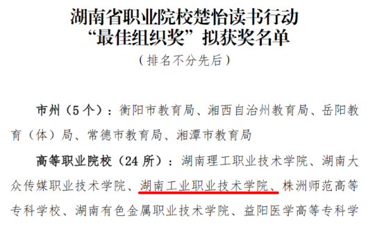 本网讯  近日,湖南省教育厅发布《关于公布湖南省职业院校楚怡读书行动“主题征文”“楚怡读书之星”“最佳组织奖” 评选结果的通知》,学校共获奖13项,其中获“主题征文”一等奖3项、二等奖4项、三等奖1项,唐春艳、郑志凌、王文灿、阮淑婷4人获评“楚怡读书之星”,学校获评楚怡读书行动“最佳组织奖”。