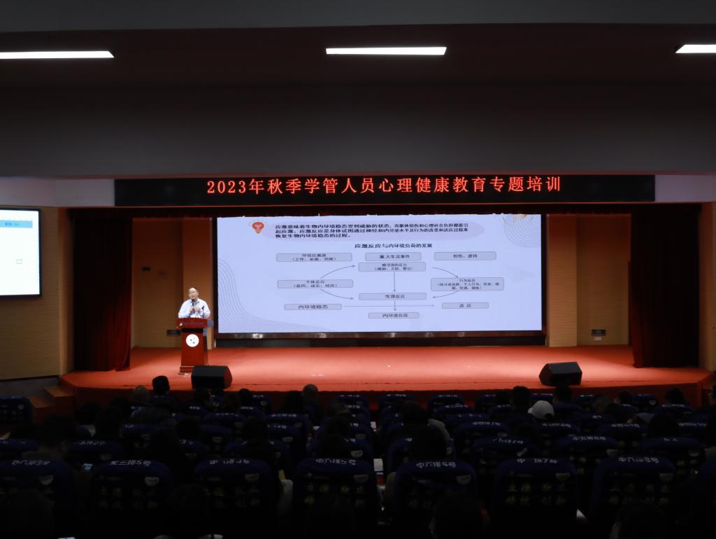 本网讯 11月14日下午,学校邀请湖南省第二人民医院身心医学科主任杨栋来校开展心理健康教育专题培训,进一步提升学生管理工作人员心理健康教育工作技能,加强心理危机干预能力,促进学校心理育人工作高质量发展。学生工作部、团委、保卫部全体教职工,二级学院党总支书记、副书记,全体辅导员、班主任,楼栋宿管、安保等人员近200人参与,培训由学生工作部副部长杨迪禹主持。
