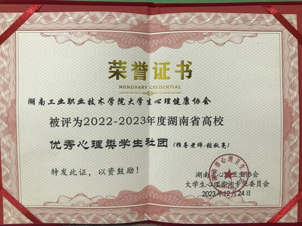 本网讯 2023年12月23-24日,湖南省心理卫生协会大学生心理咨询专业委员会第十八届学术年会在长沙召开,学校荣获2022—2023年度湖南省高校心理健康教育先进单位,大学生心理健康协会荣获2022—2023年度湖南省高校优秀心理类学生社团。