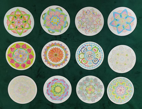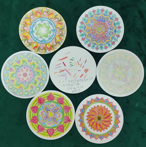 本活动由放松冥想、自由绘画、团体分享三部分组成。由赵芳老师讲解“曼陀罗”绘画的基本技巧及相关知识,学生们自由挑选曼陀罗卡片进行涂色,大家全身心都投入到绘画过程中。每一位同学都给自己的作品取了动听的名字:《自由》《感恩的花束》《向阳至上》《心之所向》……