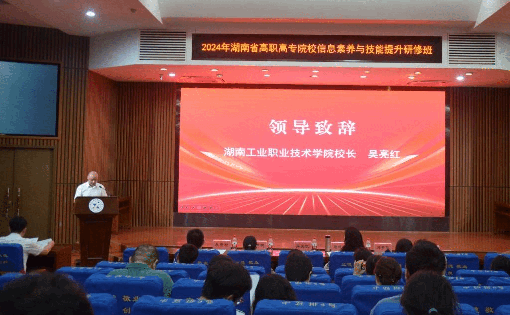 本网讯 近日,由湖南省图书馆学会主办的2024年湖南省高职高专院校信息素养与技能提升研修班在我校顺利举办。我校校长吴亮红、湖南省图书馆学会秘书长李月明出席开班仪式,来自全省43所高职高专院校的100余名图书馆负责人、信息素养教育工作者参加本次研修班。