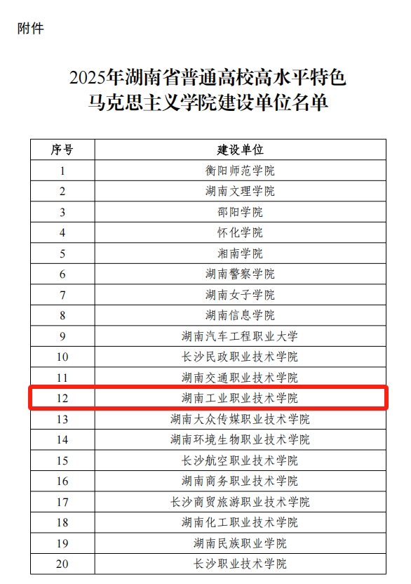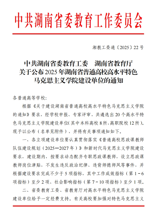 本网讯 近日,省委教育工委、省教育厅联合印发《关于公布2025年湖南省普通高校高水平特色马克思主义学院建设单位的通知》,确定包含我校在内的20所高校为“高水平特色马克思主义学院建设单位”,为学校思政理论课教学质量提升、党的创新理论宣传和社会服务等方面搭建了良好平台。