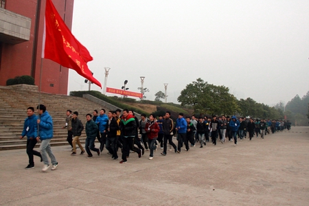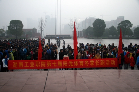 随着体育艺术部曾盛誉老师宣布活动开始的号令,迎着凛冽的寒风,满怀如火热情和青春激情的同学们排着整齐的队伍,与老师一起从新纪元广场出发,沿着学校环形公路,途经办公楼、实训楼,绕过鹤鸣山,经图书馆、公寓门口、田径场门口,最后回到新纪元广场,完成长跑路线。