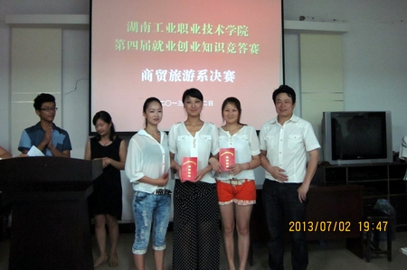 为了丰富校园文化,增强大学生就业创业知识储备,展现当代大学生良好的精神面貌和气质形象,全面拓展大学生的综合素质,7月2日,商贸旅游系在五教615举行了湖南工业职院第四届就业创业知识抢答赛系部决赛。商贸旅游系党总支副书记龙凌、杨甜老师、刘超老师、毛一老师等出席了此次大赛。