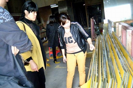 海峰玻璃的美工师向老师们介绍装饰玻璃的制作工艺