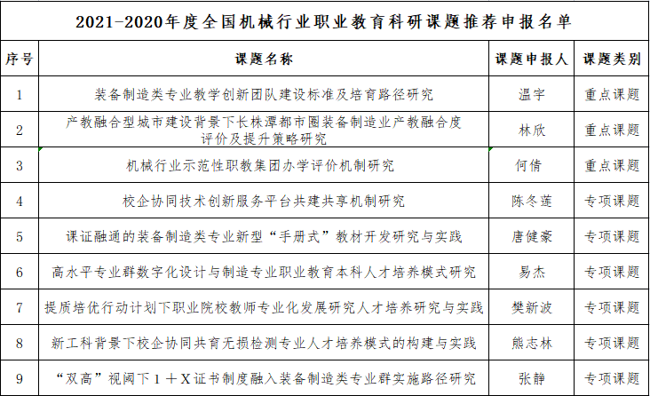 根据《关于开展2021-2020年度全国机械行业职业教育科研课题项目申报工作的通知》(机教中[2021]25号)的相关要求,经校外专家评审,学校审核批准,拟推荐我校“装备制造类专业教学创新团队建设标准及培育路径研究”等3项重点课题和“校企协同技术创新服务平台共建共享机制研究”等6项专项课题申报2021-2020年度全国机械行业职业教育科研课题,特此公示。如对评审结果有异议者,请在公示期内(10月14-10月16日)以书面形式向学校科技处或纪检监察审计处反映。科技处联系电话:0731-82946156;纪检监察审计处电话:0731-82946125。