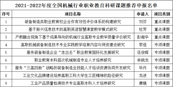 根据《关于开展2021-2022年度全国机械行业职业教育科研课题项目申报工作的通知》(机教中[2021]25号)的相关要求,经校外专家评审,学校审核批准,拟推荐机械行业先进装备制造职业教育集团“装备制造类职业教育校企合作有效性评价体系的构建研究”等3项重点课题和“高职机械装备制造技术专业实践教学培育内容与师资建设研究”等6项专项课题申报2021-2022年度全国机械行业职业教育科研课题,特此公示。如对评审结果有异议者,请在公示期内(10月16-10月18日)以书面形式向学校科技处或纪检监察审计处反映。科技处联系电话:0731-82946157;纪检监察审计处电话:0731-82946125。
