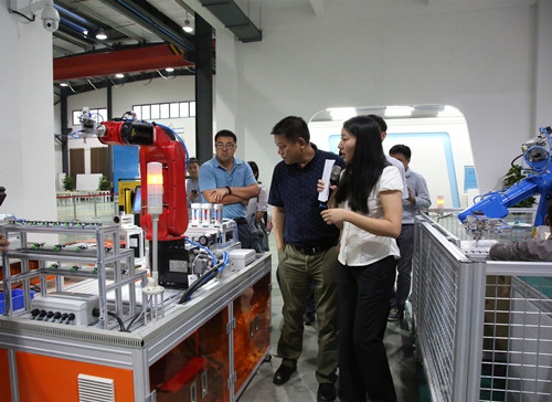一进校园,深蓝色“产教融合 校企合作”几个大字映入眼帘,主干道上的指示牌清晰明确。陈晓明一行进入机械实训楼、数控技术实训中心、汽车实训楼,沿现场推进会参观路线,考察了智能产线加工区、数控车床与铣床实训区、汽车销售与维修实训中心、顶立3D打印学院等实训室。陈晓明对学校及企业工作人员付出的努力表示肯定,赞扬学校高质量、高标准、高效率完成各项筹备工作任务,并就进一步契合会议主题,优化现场观摩安排提出了要求。