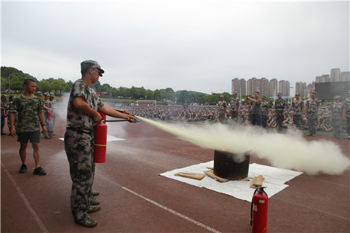 长沙市消防支队的消防官兵谢晨在大会现场为同学们演示消防器材的正确使用方法和注意事项。他强调,火灾中逃生要捂住口、鼻往上风口跑,就是朝逆风方向逃离现场。在进行消防安全知识教育后,学校组织了疏散逃生演练,同学们安全、快速、有序地从教学楼疏散到学校田径场。