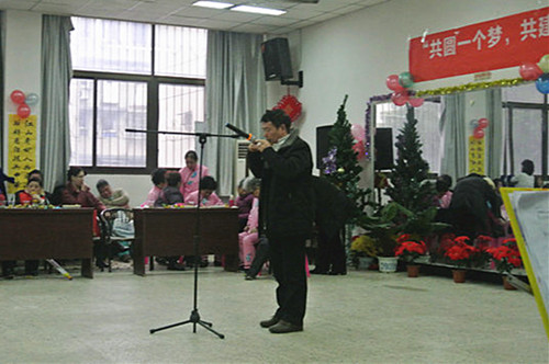 联欢会在歌舞声中拉开了序幕:离退休党总支门球队带来的男女对唱《我们走在大路上》、舞蹈队带来舞蹈《兰花花》、五支部书记樊孝春带来歌曲《儿想回家看看娘》、杨丽玲老师指导的新校区健身队带来了舞蹈《大辫子》、范金洪老师为大家带来瓷笛独奏《涛声依旧》、老校区健身队带来舞蹈《明月思》、乒乓球协会带来诗朗诵《中南海的阳光》、四支部成员带来了太极剑展示、三支部书记周双带来歌曲《中华一家人》。现场欢声笑语,座无虚席,充满了喜庆的节日气氛。