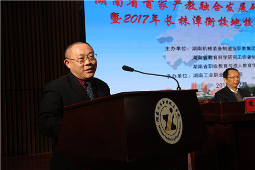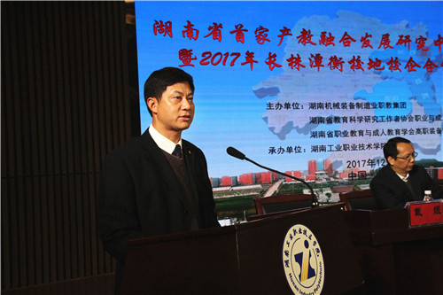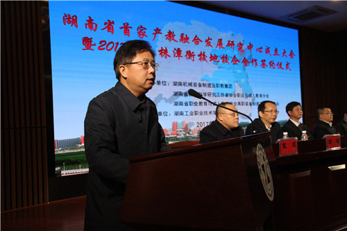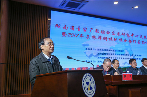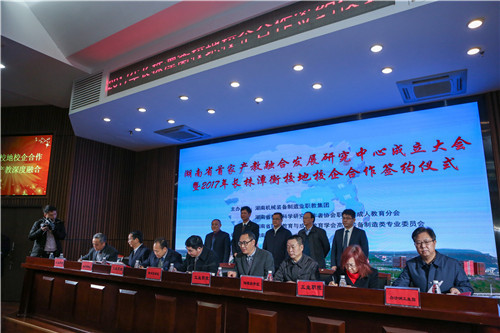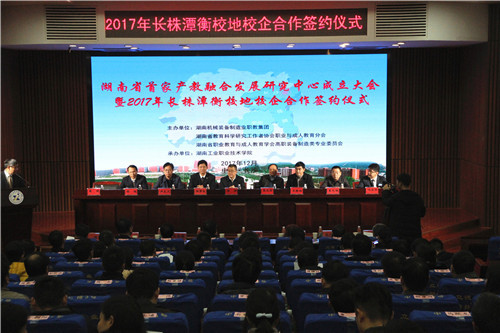 本网讯 12月1日,由省教育科学研究工作者协会职业与成人教育分会、省机械装备制造业职教集团共同主办,我校承办的湖南省首个产教融合发展研究中心成立暨2017年长株潭衡校地校企合作签约仪式在我校报告厅隆重举行。省经信委总经济师熊琛、湖南省教育科学研究工作者协会会长姜正国、我校校长向罗生、长沙国家高新技术产业开发区人力资源公共服务中心主任胡斌、株洲国家高新技术产业开发区管委会主任朱正湘、湘潭国家经济技术开发区管委会调研员总工会主席夏代银、衡阳综合保税区管委会主任尹生成出席仪式。向罗生为活动致辞,仪式由副校长董建国主持。