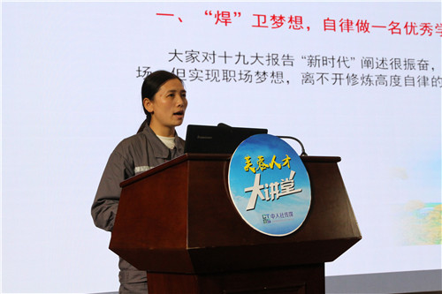 易冉以自身率队攻克制造难题的故事为例,从自律做一名优秀学子、自信做一名优秀技师、自强做一名创新能手三个方面分享了自己追逐“技师梦”的历程。她认为人的一生就是将1后面的0不断倍增的过程,必须修炼“三心”——细心,虚心,狠心。为掌握最新的焊接技术,她无惧弧光、射线辐射,在训练中,哪怕皮肤被焊渣烫得冒烟也要焊完焊缝,绝不中途停弧。