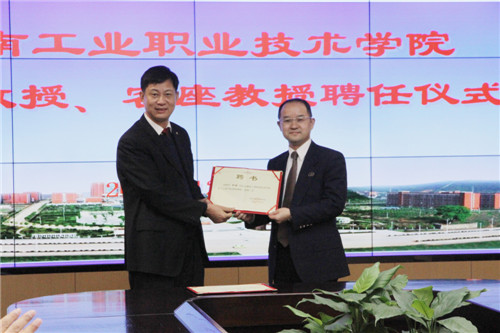 我校校长向罗生(左)为国家机械工业教育发展中心主任陈晓明(右)颁发聘书