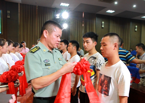 岳麓区人民武装部部长马运三为新兵戴大红花