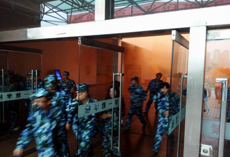 下午4:30,保卫处工作人员点燃了烟雾弹和爆炸物,并在广播中发出警报。4700名新生听到报警声后,在军训教官的带领下,全部按要求安全、有序地疏散到了军训集合地点,整个过程不到三分钟。随后,各班辅导员清点了本班人数并对疏散情况进行了汇报。