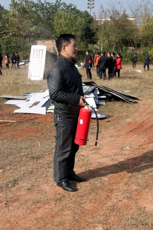 消防灭火训练现场,训练总教官盛正军老师为参加训练人员进行消防知识讲解,详细讲述了灭火器的种类、灭火时要注意的安全细节、如何正确规范使用灭火器、以及人员紧急疏散注意事项、宿舍怎样预防火灾等校园消防安全常识。盛老师一边讲解一边在点燃的干木堆上为大家示范如何操作灭火器。现场师生人手一个灭火器,根据盛老师所讲的灭火要点进行操作,不到几分钟,熊熊烈火基本被扑灭。