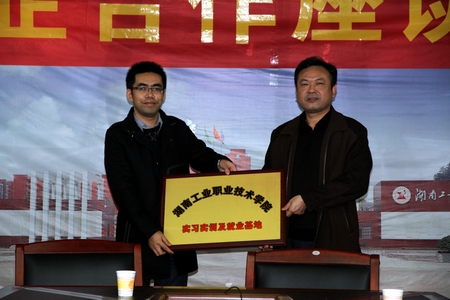 党委副书记周立华(右)代表学院为合作企业授予“实习实训就业基地”牌匾
