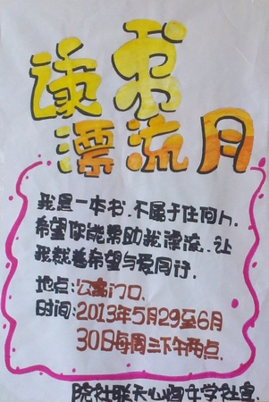 图书漂流活动起源于欧洲,该活动是指书友将自己不再阅读的书贴上特定的标签投放到公共场所,如公园的长凳上,无偿地提供给拾取到的人阅读。拾取到的人阅读之后,根据标签提示,再以相同的方式将该书投放到公共环境中去。这种好书共享方式,让“知识因传播而美丽”。