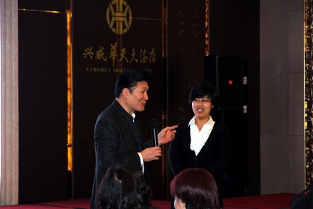 教育部原新闻发言人、语文出版社社长王旭明(左)讲座现场同与会者互动