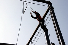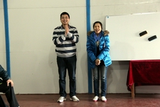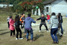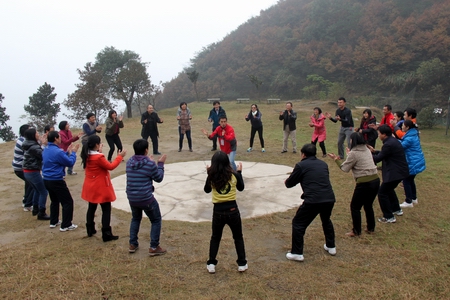 拓展训练中,老师们从游戏中彼此合作打破陌生隔阂、形成坚强团队