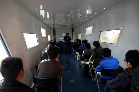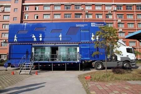 据蒂森克虏伯电梯亚太培训学院培训讲师迟群艺介绍,蒂森克虏伯电梯(中国)是继蒂森克虏伯电梯(德国)之后第二个、亚洲第一个拥有此类独特培训设备的子公司,全球仅有两辆蒂森克虏伯电梯培训车。此双层培训车的车头为梅塞德斯奔驰进口,车长17米,犹如现实版“变形金刚”——行驶时第二层收起,车身高3.9米;停车培训时,第二层展开,车身高近7米。内部第一层配有培训必需的所有设备,包括蒂森克虏伯在中国市场最普遍运用的各类组件,如曳引机、控制系统和门机系统。可伸缩的第二层则用作多媒体培训教室。与此同时,培训车还装有GPS和远程视频监控系统,以便位于上海的亚太区培训学院能随时了解培训车的精确位置和学员培训情况。