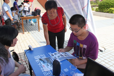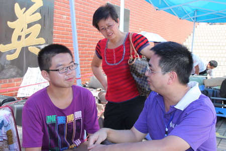长沙的秋天,35度高温,志愿者至始至终的热心引导和帮助让大男孩于泽杰有点不好意思。于妈妈则对志愿者的周到服务赞不绝口,要于泽杰虚心向学长学习。