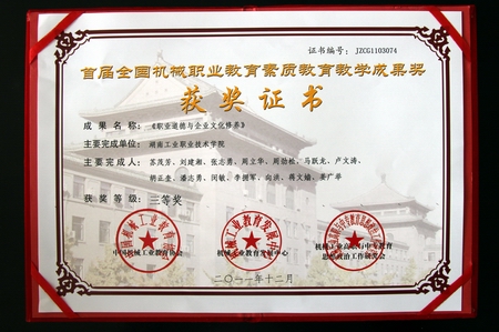 我院由廖洪元、周立华、卢文涛等人完成的《文化对接:高职学院校园形态企业文化教育问题研究》以及由王柏林、周立华、侯新华等人完成的《新形势下高职院校辅导员德育课创新与实践》均获首届全国机械职业教育素质教育教学成果奖二等奖,由刘建湘、张志勇、苏茂芳等人完成的《职业道德与企业文化修养》获得三等奖。与此同时,我院获首届全国机械职业教育素质教育教学成果奖优秀组织奖。