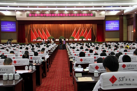 会上,市委常委、副市长、第七届中博会长沙市组委会常务副主任陈泽珲作第七届中博会我市工作总结报告;市委副书记张值恒宣读市委办公厅、市政府办公厅表彰通报;市委副书记、常务副市长张迎龙宣读第七届中博会我市组委会表彰通报,对10个获得“突出贡献单位”称号,55个获得“先进单位”称号,297名获得“先进个人”称号,36家获得“优秀窗口服务单位”称号及102名获得“优秀志愿者”称号的单位和个人进行了表彰。会议由我市市委副书记、市长张剑飞主持。
