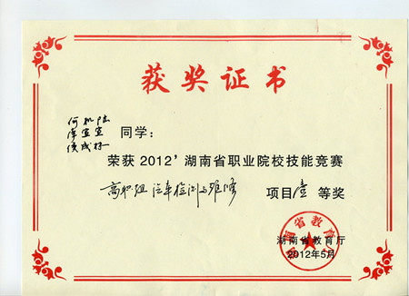 在本次竞赛中,我院汽车工程学院共派出三支代表队参加比赛。我院代表队以高超的专业技能和良好的团队合作精神,沉着冷静、积极应战,汽车检测与维修两支参赛队均取得佳绩。其中,何机陆、李宣宣、侯成林三名选手发挥出色,勇夺2012年湖南省职业院校高职汽车检测与维修技能大赛第一名(一等奖);桂志伟、黄超、徐万禄三名选手夺得第十名(三等奖)。模具参赛队两名选手袁世杰、彭丽夺得高职工业产品造型设计与快速成型技能大赛第二名(二等奖)。