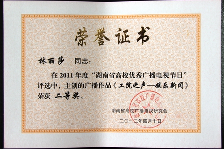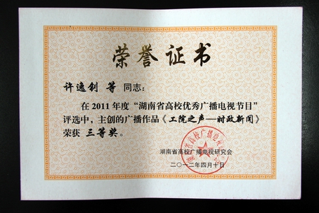 为进一步推动我省高校广播电视宣传工作的发展,提高我省高校广播电视节目的水平,根据湖南省广播电视局《2011年度湖南广播电视奖评选方案》和省高校广播电视研究会《关于评选2011年度湖南省高校优秀广播电视节目的通知》精神,我院认真准备,积极推荐广播电视节目参加评选。经过认真、客观、公正的评审,日前,省高校广播电视研究会通报了获奖名单,我院宣传部所选送的、由林丽莎同学主创的广播节目《工院之声——娱乐新闻》获得广播类二等奖,由许逸钊、彭丹两位同学主创的《工院之声——时政新闻》获得广播类三等奖,由我院党委书记龙承海等人主创的《攀登》获电视类三等奖。