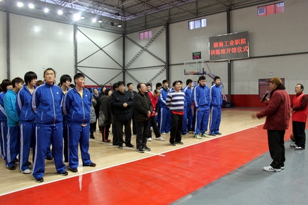院工会主席张志勇主持开馆仪式。副院长刘继平致辞,代表学院党委对训练馆的正式开馆表示热烈的祝贺。他说,近年来学院体育事业蓬勃发展,在各大篮球、排球、田径等赛事中斩金夺银,学院训练馆的投入使用,为教育教学、师生体育活动创造了更好的条件,是学院贯彻“德、智、体”全面发展教育方针的又一件大喜事,也是学院“后示范”建设的首个项目,大幅度提升学院服务师生水平的同时,也为通过体育文化与各兄弟院校、各级领导单位、组织团体加强交流和联系提供了新的、更好的平台。他相信,有了新的训练馆,我院的体育事业将会取得更加辉煌的成绩。