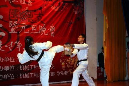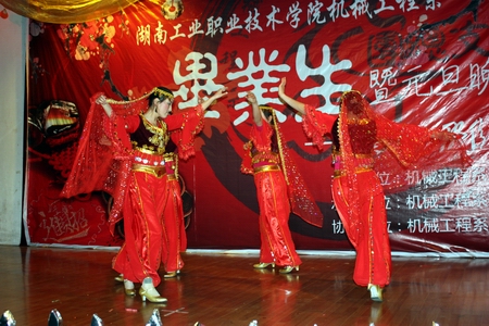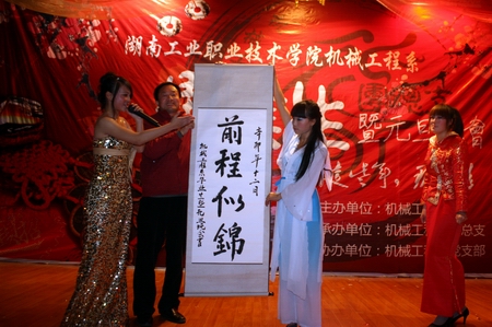 第二篇章——“春蚕赞”中老师的声声朗诵,祝福着即将迈向实习、工作岗位的大三学子,希望他们能够飞得更高、更远,也希望他们可以常回家看看;精彩的中国武术与双截棍的结合表演则将晚会推向高潮;动情的朗诵《感恩老师》——“老师你是园丁、老师你是蜡烛,老师你是灯塔、老师你是航帆”表现了学子对老师的感激之情;接下来师生同台演出的舞蹈《何茫然》、机械工程系主任皮智谋现场书写的书法作品“前程似锦”,表达的是老师对同学们的美好祝愿。