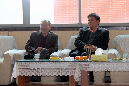 我院党委书记廖洪元(左)出席座谈会 对陈晓明副主任(右)一行的到来表示欢迎