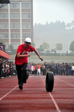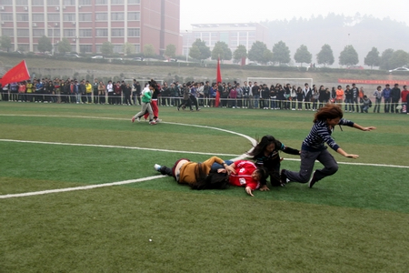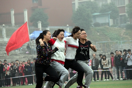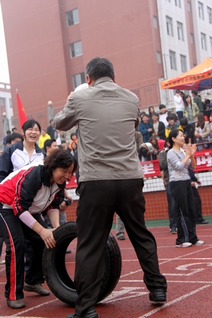 我院院长刘建湘(左一)参加趣味运动会“三人四足”比赛 与教职员工们一起快乐奔跑