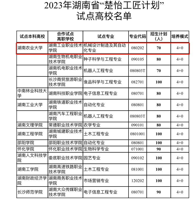 本网讯 近日,湖南省教育厅下发了《关于实施“楚怡工匠计划”试点工作的通知》,学校入围首批“楚怡工匠计划”,将与湖南农业大学合作试点本科“机械设计制造及其自动化专业”,专业代码为080202,招生计划70人,培养模式4+0,即4年均在学校培养,学生入校后由两校共同组建优质师资团队授课,毕业时授予湖南农业大学普通本科毕业证书和学位证书。