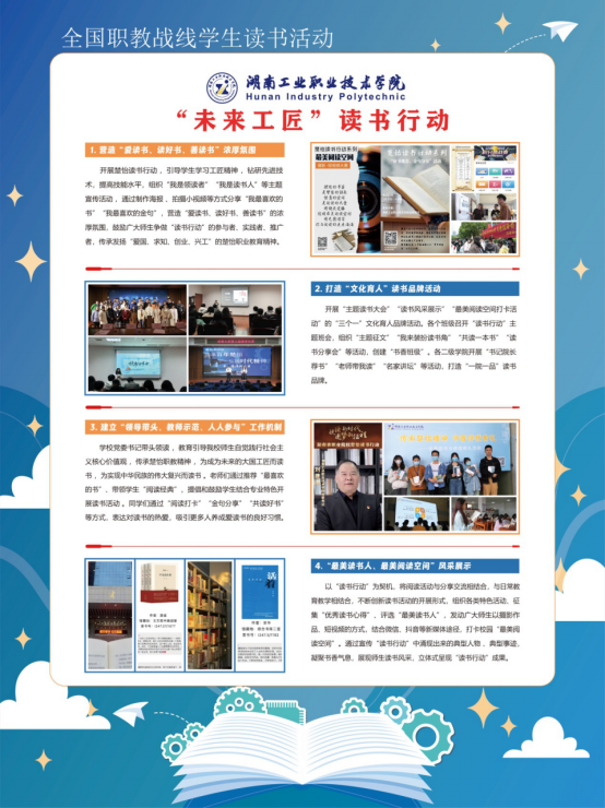 在全国职业院校“未来工匠”读书行动展示活动现场,我校从四个方面向参会嘉宾展示读书行动成效,一是营造“爱读书、读好书、善读书”的浓厚氛围,鼓励广大师生争做“读书行动”的参与者、实践者、推广者,传承发扬“爱国、求知、创业、兴工”的楚怡职业教育精神。二是打造“文化育人”读书品牌活动,开展“主题读书大会”“读书风采展示”“最美阅读空间打卡活动”的“三个一”文化育人品牌活动。三是建立“领导带头、教师示范、人人参与”工作机制,学校党委书记带头领读,老师们通过推荐“最喜欢的书”、带领学生“阅读经典”,提倡和鼓励学生结合专业特色开展读书活动,同学们通过“阅读打卡”“金句分享”“共读好书”等方式,表达对读书的热爱。四是开展“最美读书人、最美阅读空间”风采展示,将阅读活动与分享交流相结合,与日常教育教学相结合,不断创新读书活动的开展形式,凝聚书香气息,展现师生读书风采,立体式呈现我校“读书行动”成果。
