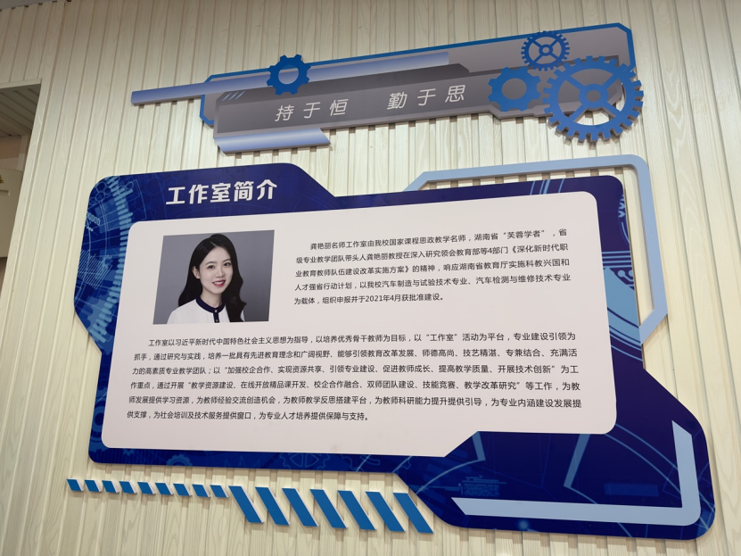 龚艳丽“双师型”名师工作室由我校国家课程思政教学名师,湖南省“芙蓉学者”,省级专业教学团队带头人龚艳丽教授在深入研究领会教育部等4部门《深化新时代职业教育“双师型”教师队伍建设改革实施方案》的精神,响应湖南省教育厅实施科教兴国和人才强省行动计划,以我校汽车制造与试验技术专业、汽车检测与维修技术专业为载体,组织申报并于2021年4月获批准建设。
