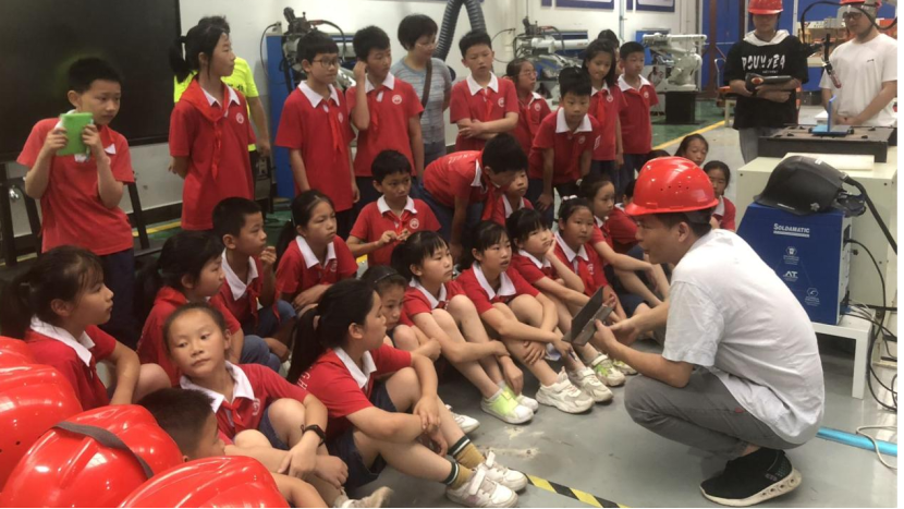 第二站参观的是智能焊接实训基地,由罗杨老师和我院学生边操作边向学生们讲述工业机器人的操作和焊接的相关知识,学生们积极地参与,在做好保护措施的前提下亲自体验智能焊接的奇妙,充分激发了小学生们对智能制造技术的好奇。