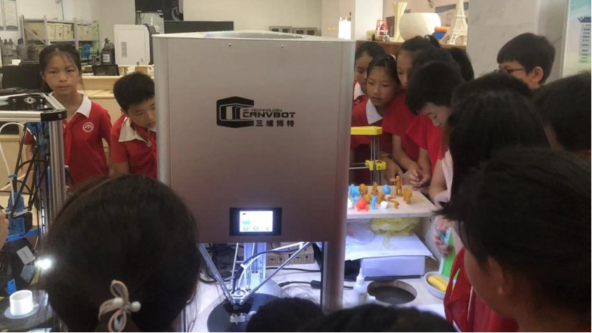 第三站参观的是3D打印实训室,室内成列着多样的3D打印成果和打印设备,由3D打印协会的两位成员向小学生们介绍3D打印物品、3D打印原理、3D打印设备的操作流程,学生们围观打印过程对3D打印技术充满了新奇。