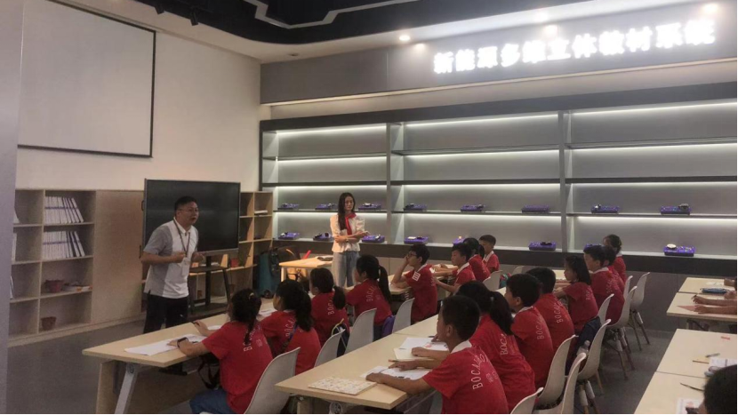 博才中海小学的跳跳糖中队第一站参观的是新能源汽车实训基地,由葛毅、 刘云飞老师向小学生们讲解新能源汽车的的工作原理以及相关知识,带领学生参观了新能源汽车内部构架和智能电车,以及由我院蜂鸟车队制作的新能源电车,让小学生们充分切身感受,学生们观看和体验后都感到非常惊奇,充满了兴趣,有许多同学争先恐后地向老师提出:新能源汽车电池的寿命是多久?新能源汽车有什么缺点?等有关新能源汽车的时实热点问题和疑惑。